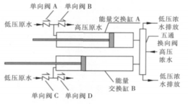 低壓原水從單向閥 A 或單向閥 C 進(jìn)入能量回收裝置,充滿能量交換缸 A 或 能量交換缸 B;高壓濃水從五通換向閥進(jìn)入能量回收裝置,當(dāng)五通換向閥使高  壓濃水與能量交換缸 A 連通時(shí),高壓濃水將能量傳遞給低壓原水,實(shí)現(xiàn)能量交 換,高壓原水從單向閥 B 進(jìn)入反滲透膜壓力容器進(jìn)行脫鹽處理;待將能量交換 缸 A 中的原水全部加壓送至反滲透系統(tǒng)后,五通換向閥,將高壓濃水與能量交 換缸 B 連通,重復(fù)上述能量交換過(guò)程,同時(shí)能量交換缸 A 中低壓原水進(jìn)入,排 出低壓濃水。兩個(gè)能量交換缸交替進(jìn)行高壓濃水與低壓原水的能量交換,實(shí)現(xiàn)  將低壓原水連續(xù)增壓送至反滲透系統(tǒng)進(jìn)行脫鹽處理。